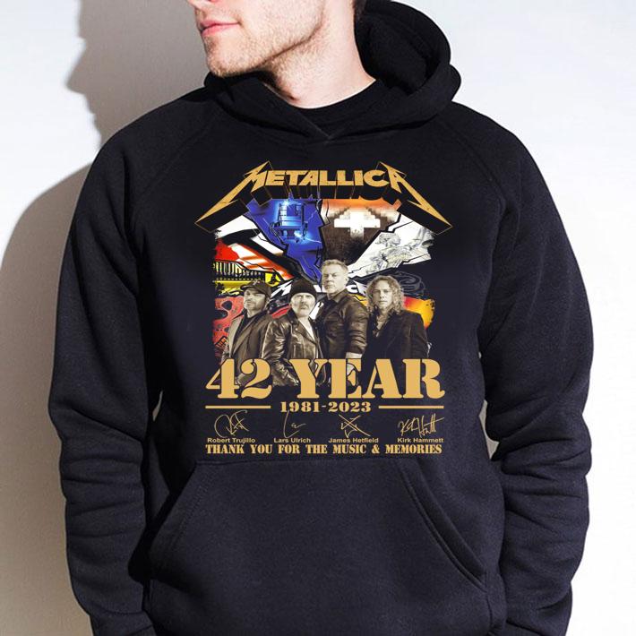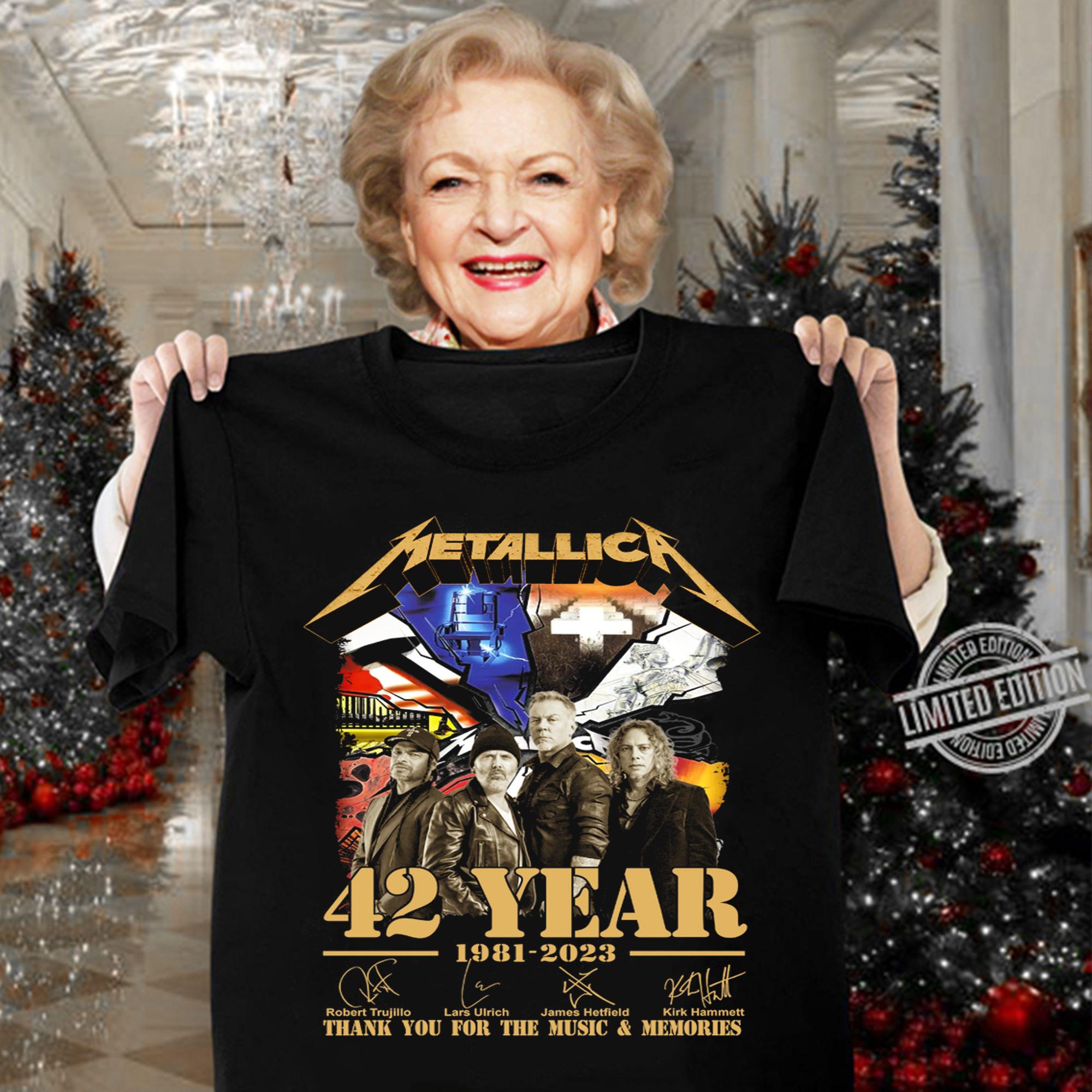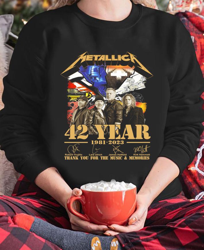 Shop our Metallica 42 Year 1981-2023 t-shirt, featuring Thank You For The Music & Memories Signatures. Show your love for the iconic band and rock out in style. Order now!